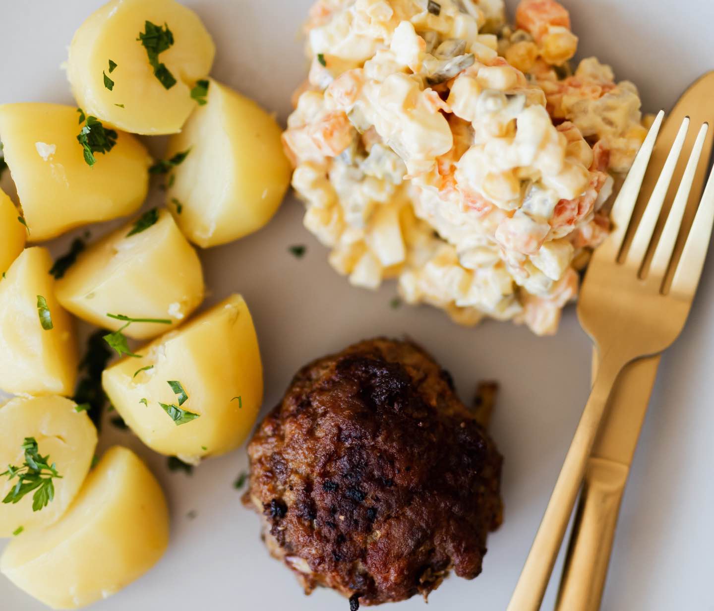 Bring a pan of salted water to the boil and add the new potatoes. Simmer gently for 12-15 minutes until tender. Drain and tip into a large bowl.